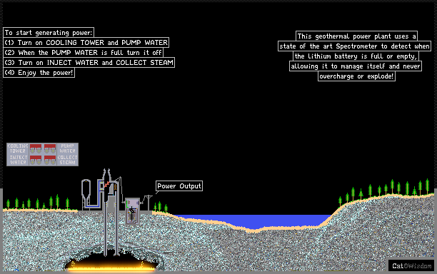 This power plant uses geothermal heat to turn water into steam to power a turbine. The power generated is stored in a LITH battery that uses a laser spectrometer to make sure the battery never overcharges and explode!