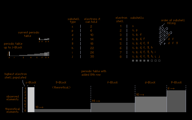 This one's a purely decorational save, sorry everyone. I decided to illustrate how the periodic table works due to the behavior of electron subshells. Might make a proton-neutron nuclide chart next.