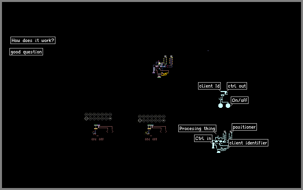 It's my first "computer" and it's not very complex. It is a simulation that takes the controls of a device, recognised by a and gate and a few switche, processes the input into a position, and is then transmited to the screen.